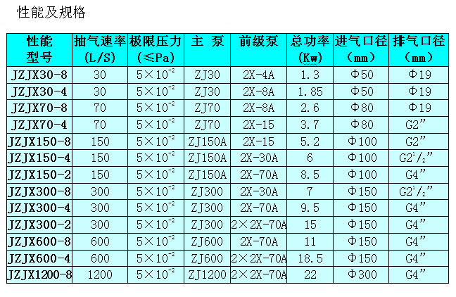 JZJX是以罗茨泵为主泵,以旋片泵为前级泵串联而成。其结构紧凑,操作方便。适用于抽除空气及其它无可凝性及无腐蚀性的气体,广泛应用于需要大抽速和高真空的各种真空系统中。如:真空冶炼,电力电容器,变压器,真空浸渍处理,真空镀膜设备中的预抽等。