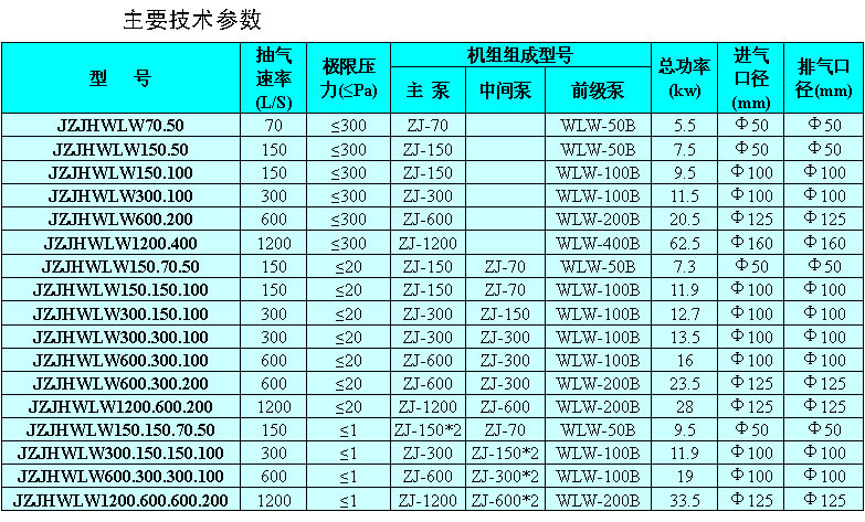 JZJW型罗茨-立式无油往复泵机组是以ZJ型罗茨泵为主泵,以WLW型立式无油往复泵为前级泵串连而成。克服了WLW型真空泵极限压力高,在一定压力下抽气速率低的缺点,同时又保留ZJ型罗茨泵工作迅速、有较大抽气速率的优点。所以该机组被广泛运用于化工行业的真空蒸馏、真空蒸发、脱水结晶;食品行业的冷冻干燥,医药行业的真空干燥等工艺过程中。